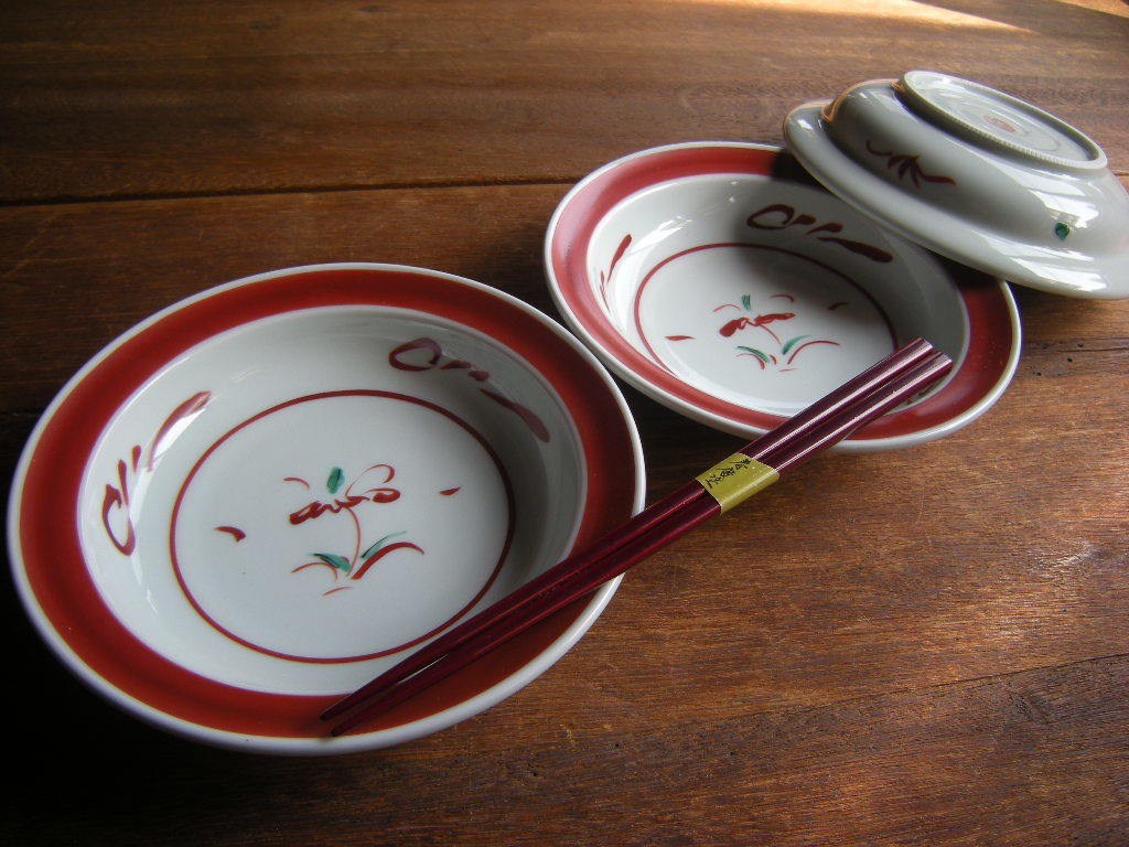 - 料亭うつわ◇現品限り【新品*廃番】手描き 赤絵 朱帯 小花 円山皿 6寸(18㎝x4㎝)1枚から *掘り出し物*廃番商品*