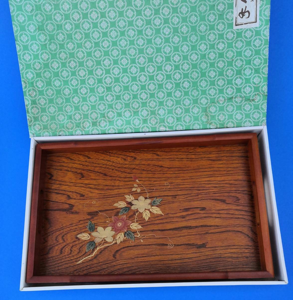 - 昭和レトロ花の絵描かれた木製角型お盆木目が綺麗未使用保管品