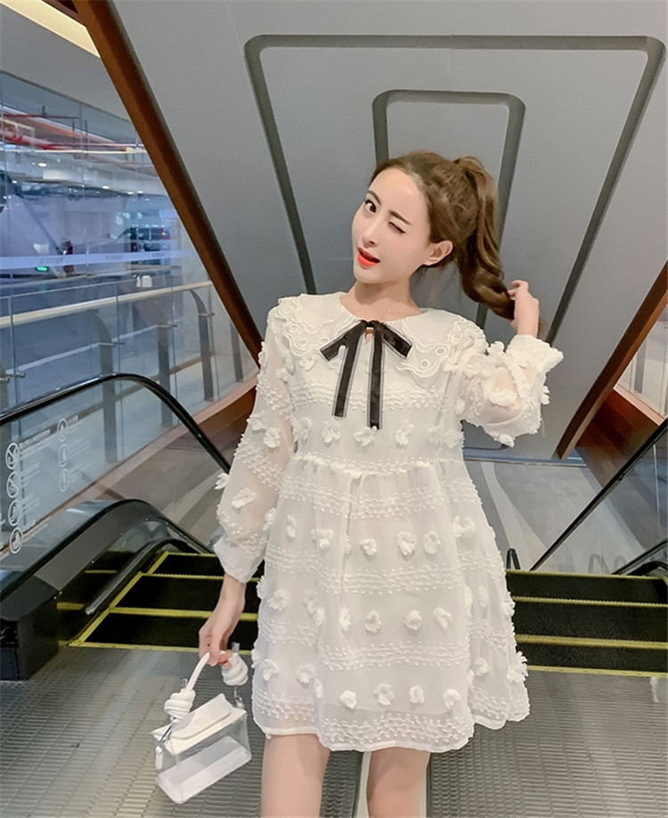 - 白 M ワンピース ミニ ガーゼ風 春 夏 ボンボン花飾り 724201 レディース ホワイト 長袖 春 夏
