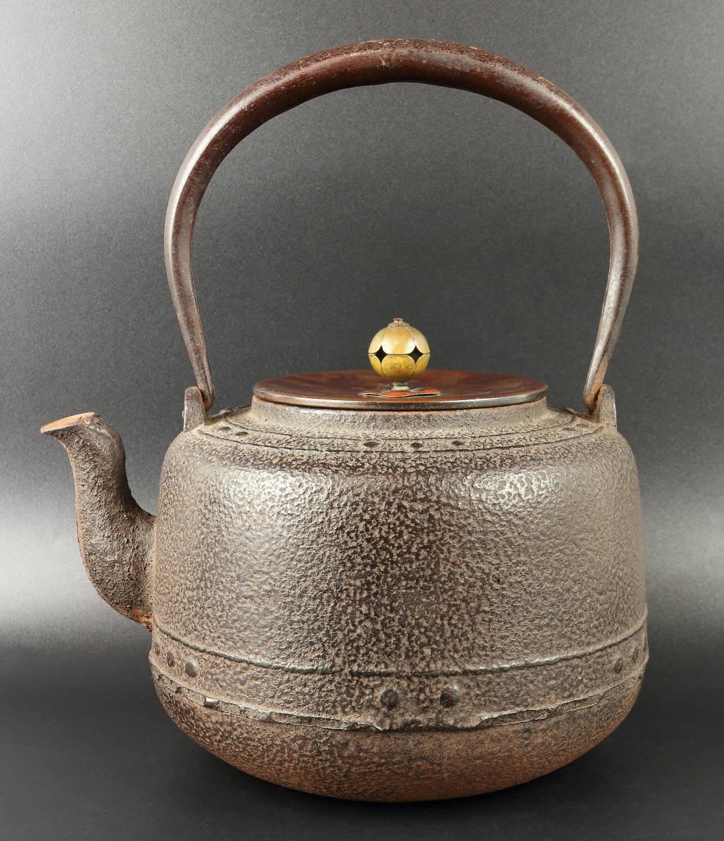 - 【梟】時代 鉄瓶 斑紫銅蓋 肩衝形 肩衝型 鉄製 鉄器 文様 茶道具 釜師 煎茶道具 茶瓶 急須 水注 水差し 茶壺 茶壷 中国茶 台湾茶 古玩