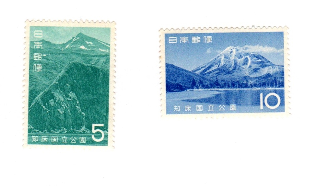 - 昭和40年1965「第2次国立公園切手 知床/斜里海岸と知床硫黄山~羅臼湖畔と羅臼岳」5円+10円切手 未使用 送料無料 熊五郎の切手 00800206