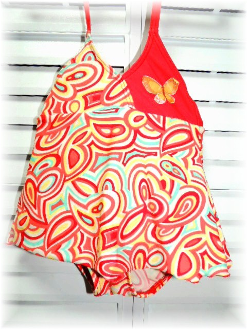 - 西松屋 ネックホルダー ワンピース水着 95cm ライトブルー(ペイズリーのような柄)×レッド(蝶々プリント)