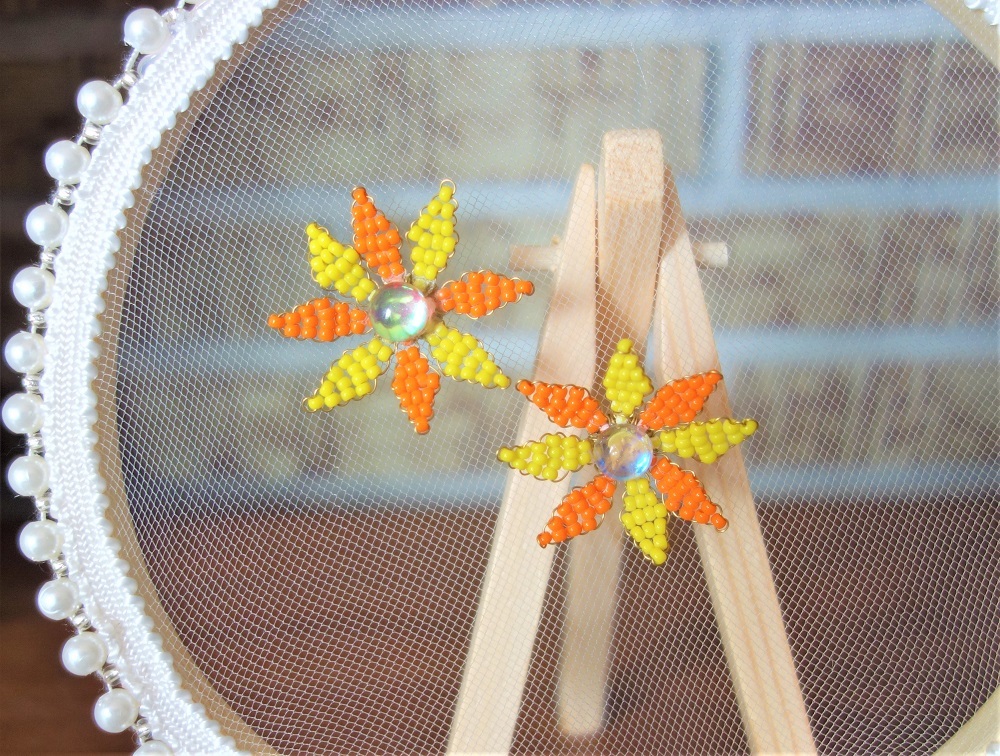 - 【ひまわりピアス/ビーズ編みフラワーピアス】送料無料/ハンドメイドアクセサリー