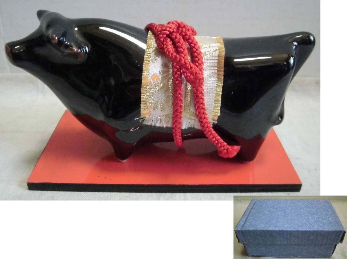 - 干支置物 黒塗 丑 飾り台付(リバーシブル) 箱入り うし 牛 陶器 工芸品 置物 飾り物 オブジェ 開運 縁起物 レトロ