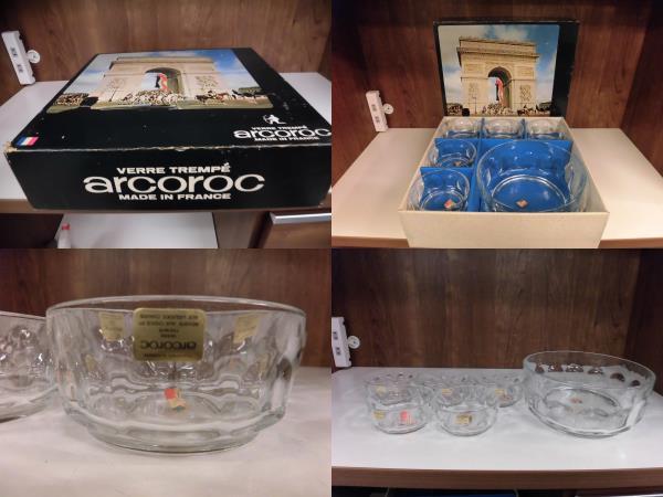 > arcoroc・フランス製・ガラスボウル大1コ&小5コセット (未使用品) / ビンテージ・共箱あり サイズ 全高・大10小5×口径大22小11㎝