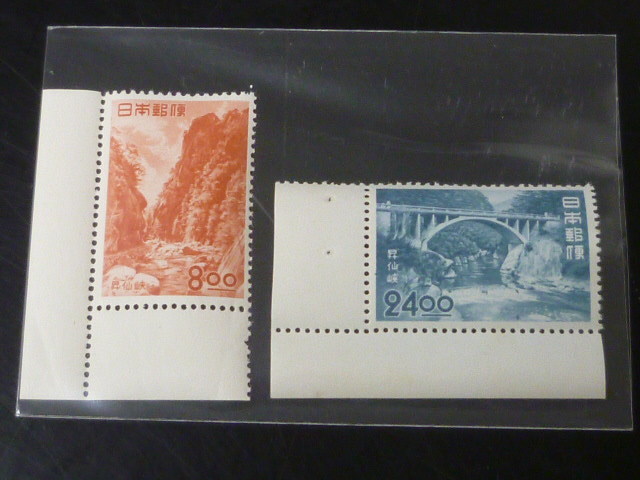> 21EA S 日本切手 1951年 観光地百選 記215-216K 昇仙峡 コーナー耳紙付 計2種 未使用NH・VF