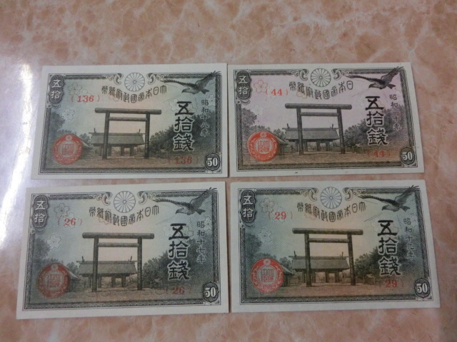 - ★ 政府紙幣 靖国50銭 17年・18年・19年・20年 未使用 4枚 ★ No.506