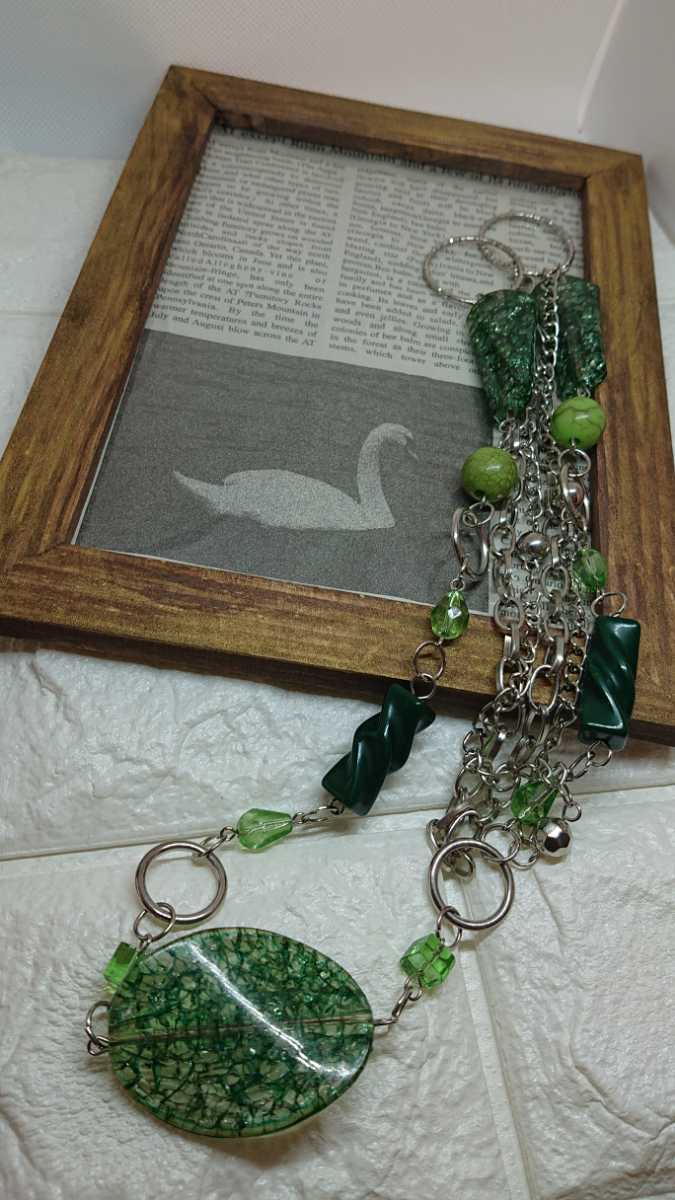 - □涼しげ&華やか□グリーン×クリアカラーのMIX□シルバーカラーチェーンのロングネックレス□