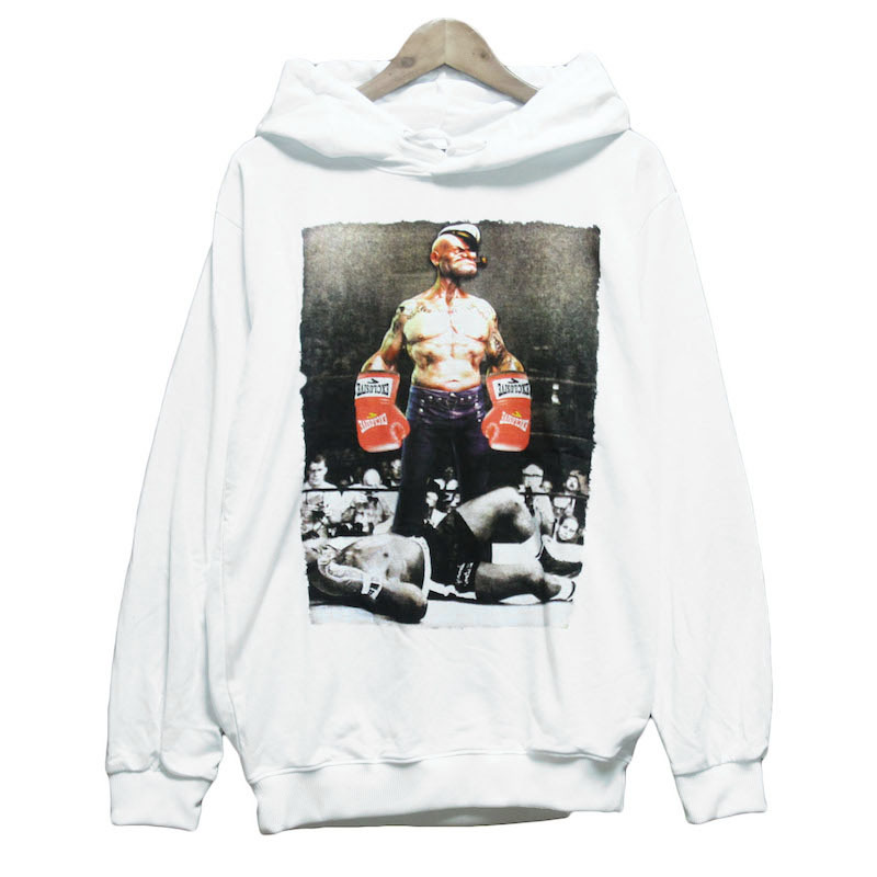 - プルオーバーパーカー メンズパーカー ポパイ モハメドアリ ボクシング ストリート系 スウェット フード付き 薄手 春物 ★pk0018-wht-m
