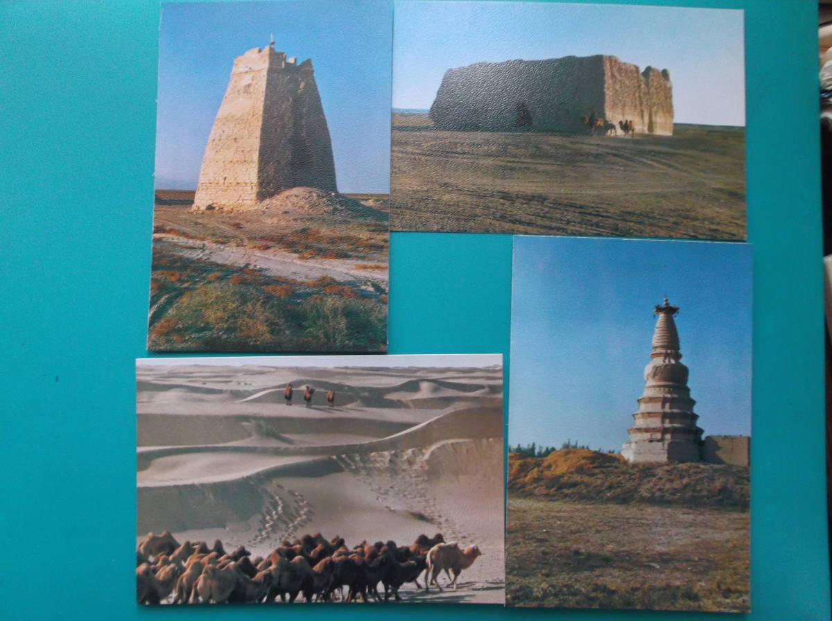 - 昔の絵葉書 8枚組袋付 中国大陸 敦煌名勝古跡 清代汎 玉門関 陽関遺跡 白馬塔 三日月泉 莫高窟 漢代長城 渥池(ゴビ砂漠)