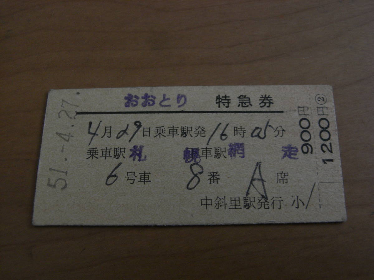 - おおとり 特急券 乗車駅 札幌 下車駅 網走 昭和51年4月27日発行 中斜里駅発行
