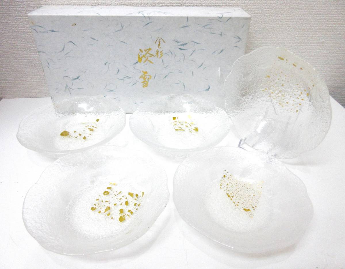 - 未使用品▲YOSHITANI GLASS 吉谷硝子 江戸硝子金彩淡雪 小皿 5客セット 箱入 日本製 ギフト 管理2104 F-8