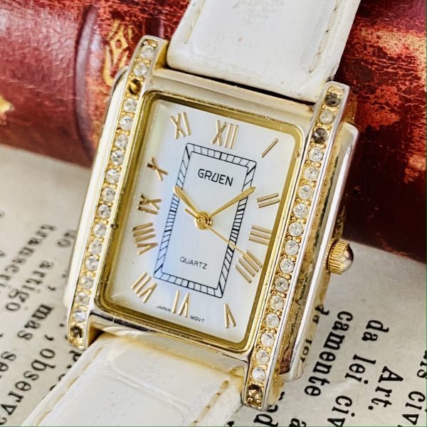 - 【高級時計グリュエン】Gruen クォーツ デイト 腕時計 レディース ビンテージ ブレスレット カクテル ウォッチ クリスタル 白ベルト