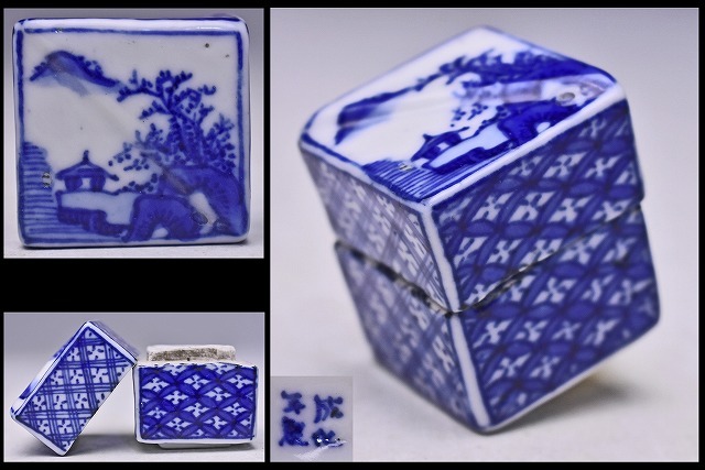 > 成化年製 在銘 ★ 染付 山水文足付 香合 ★ 香道具 ★ 小品ながら丁寧な仕事の可愛い逸品 ★