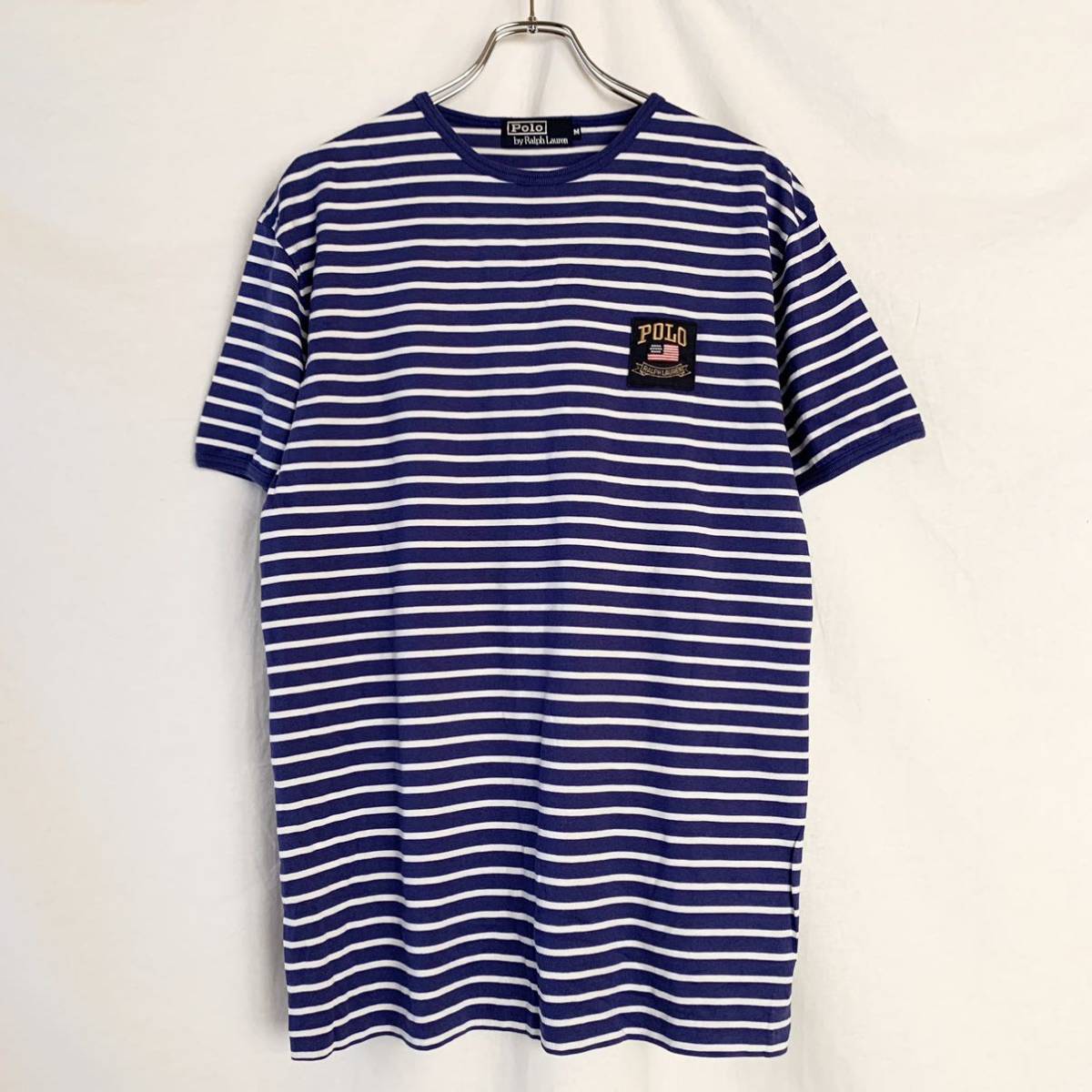 > 90s Polo by Ralph Lauren ポロ ラルフローレン 半袖 ボーダーT M 青×白 マリン ヴィンテージ Tシャツ 星条旗 ロゴ