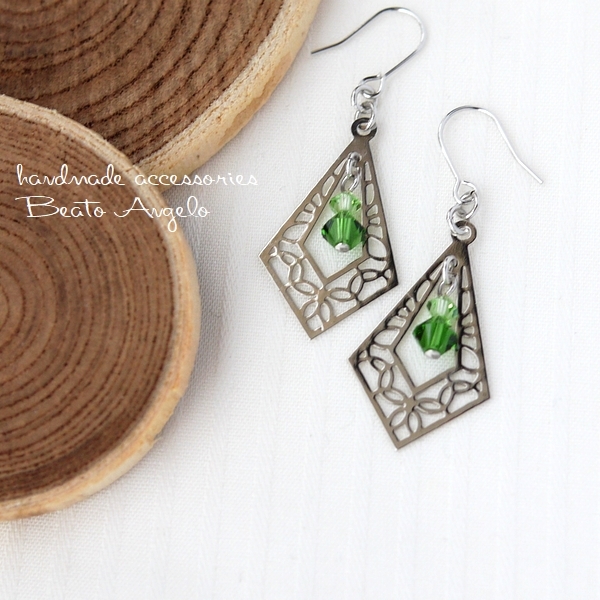 > ◇◆+angelo+スワロフスキーとKi透かしのピアス(p-038)ファーングリーン S チタン 樹脂 イヤリング