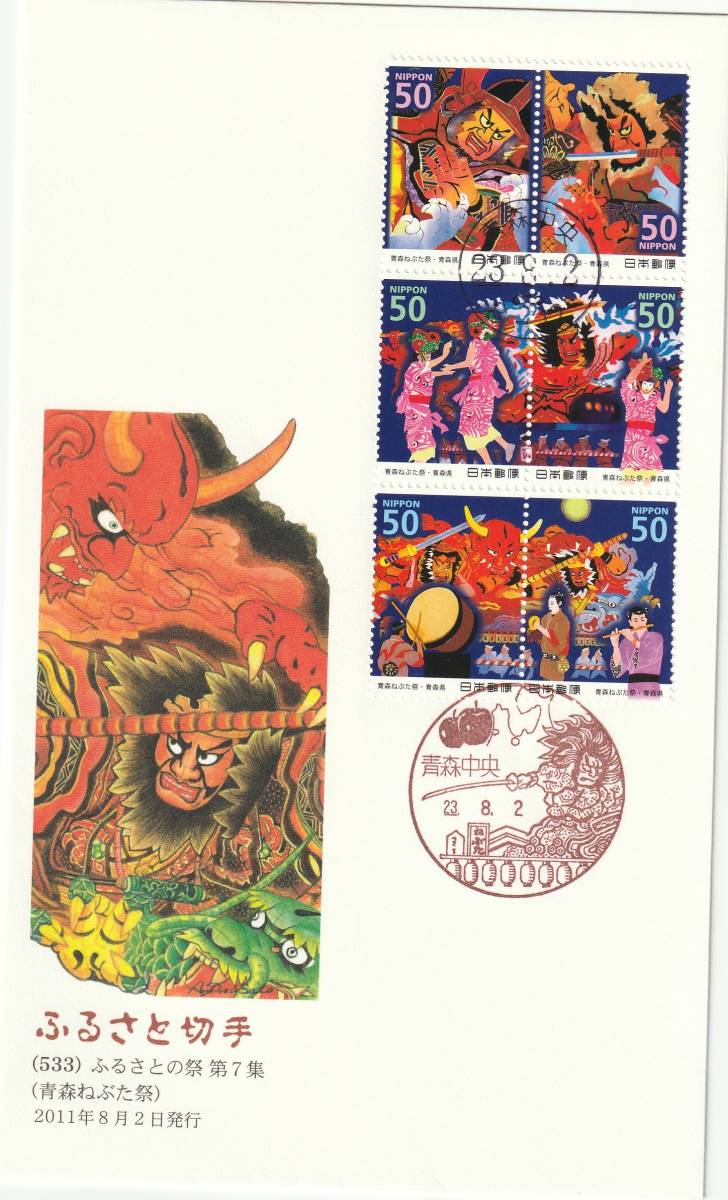 - FDC 2011年 ふるさとの祭り 第7集 青森ねぶた 50円6貼 絵 佐藤顯彦