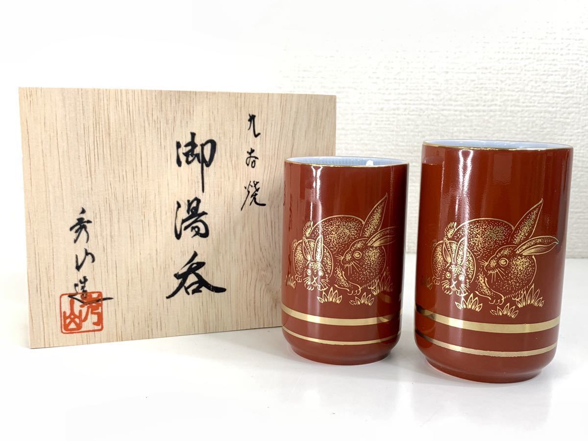 > 未使用品▼九谷焼 秀山造 銀彩うさぎ夫婦湯呑 2客セット ペア 銘あり 木箱あり 管理2108 Q-11