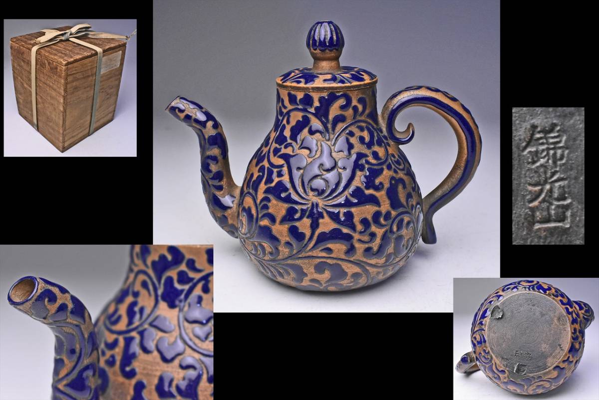- 時代 錦光山 ★ 古清水 ★ 瑠璃釉盛絵付唐草文水注 ★ 木箱 ★ 希少作 ★