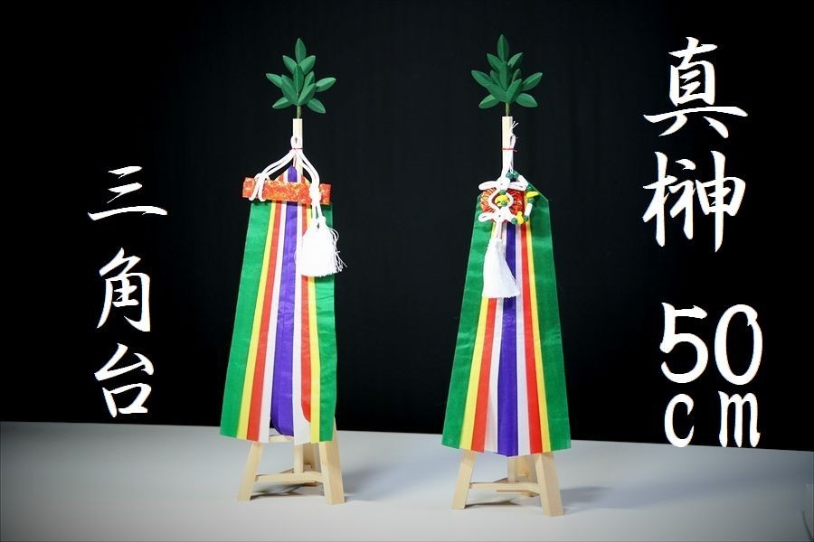 - ■真榊 三角台付 神棚 神具■まさかき 大・特大 神棚用 50cm ■ 三種の神器 五色の絹