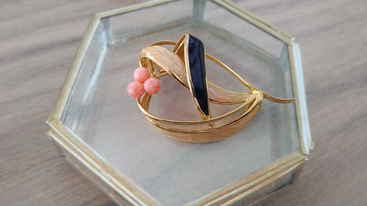 - □ゴールドカラー×珊瑚色ビジュー×紺色・フラワーモチーフ ブローチ□