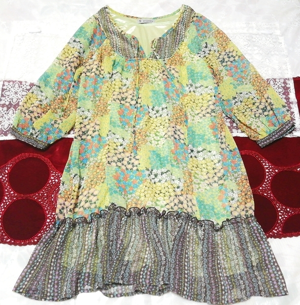 > 黄緑赤森花柄シフォンチュニックネグリジェ Yellow green red flower forest pattern chiffon tunic negligee dress