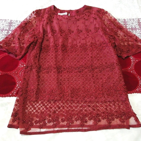 > 赤ワインレッド花柄レース半袖チュニック ネグリジェ ナイトウェア ワンピース Red wine red floral lace tunic negligee dress