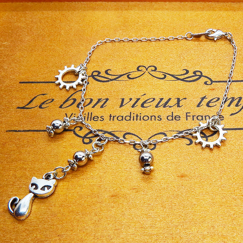 - スチームパンク風 猫と歯車のブレスレット メタルビーズ シルバーカラー 繊細