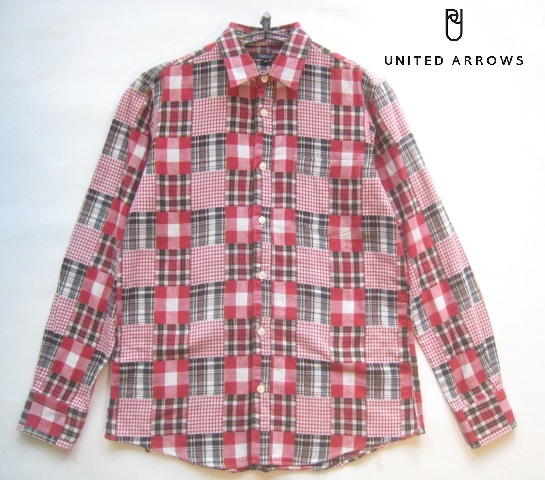 > 美品!!ユナイテッドアローズ UNITED ARROWS*日本製 チェック柄コットンパッチワークシャツ M 赤系
