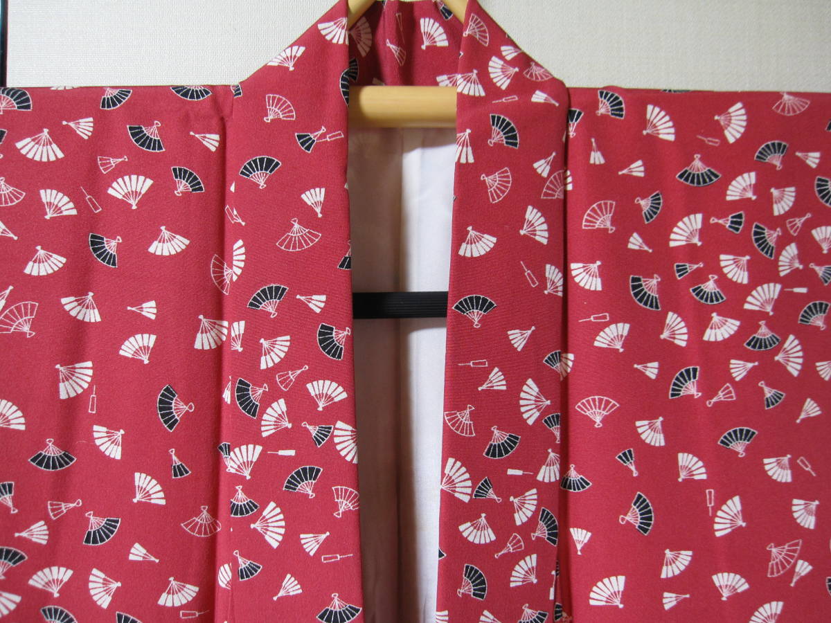 > 小紋 正絹 扇模様ローズ系地色小紋 ゆき64.5 袖丈56.5(長めです)。 街着 観劇 名古屋帯 なごや帯