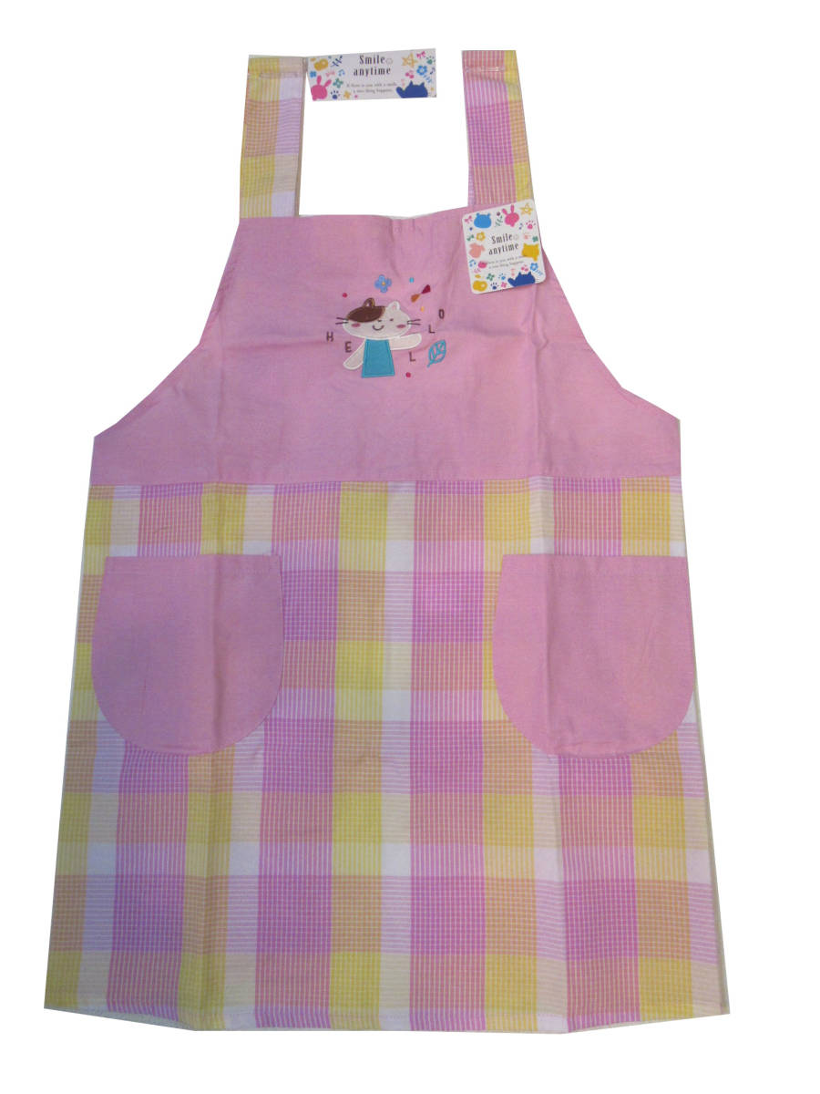 - エプロン キッチン エプロン アップリケ刺繍付き チェック柄 H型キッチン サービス品 ピンク 猫★