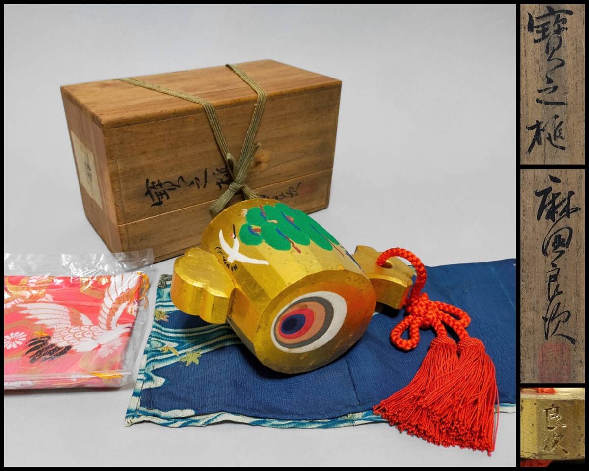 - O20 木彫 置物 春日有職 麻田良次 寶之槌 彩色宝珠松鶴雛図 共箱 床飾 縁起物 金運 子宝
