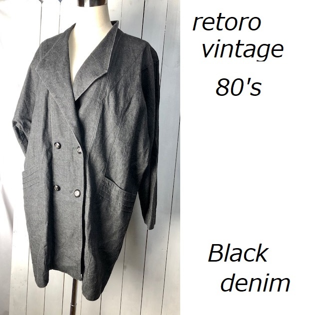 - 80s 国産レトロ古着 ゆったり ダブルブレスト ブラックデニムロングコート アトリエコート レトロ オールド ヴィンテージ 黒 日本製 ●68