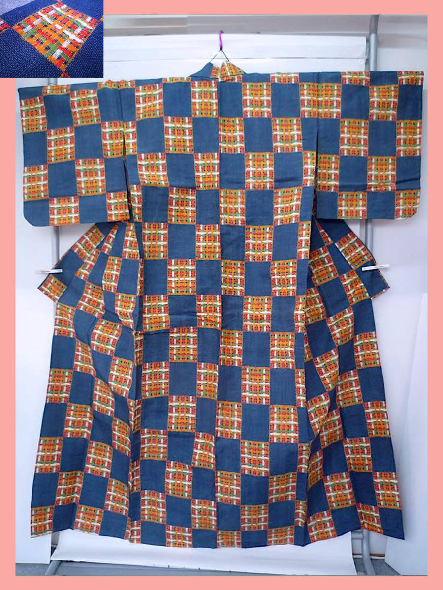 > お得 未使用保管品 着物 逸品 正絹 紬? 市松文様 四角 秋物 単衣 身丈約160㎝ 裄丈約64㎝ 変わり織 リメイク テーブルクロス 定形外 B5