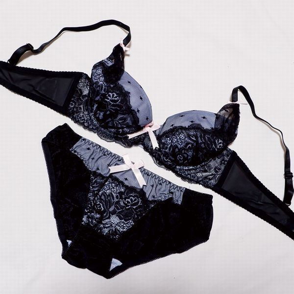 - 未使用 B75M 寄せ上 薔薇レース ブラ&ショーツ 黒 新品