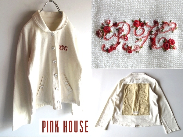 - PINK HOUSE ピンクハウス 薔薇/バラ/花柄PH刺繍 ロゴワッペン 大判生地パッチワーク コットンニット 丸襟ジャケット カーディガン M 日本製