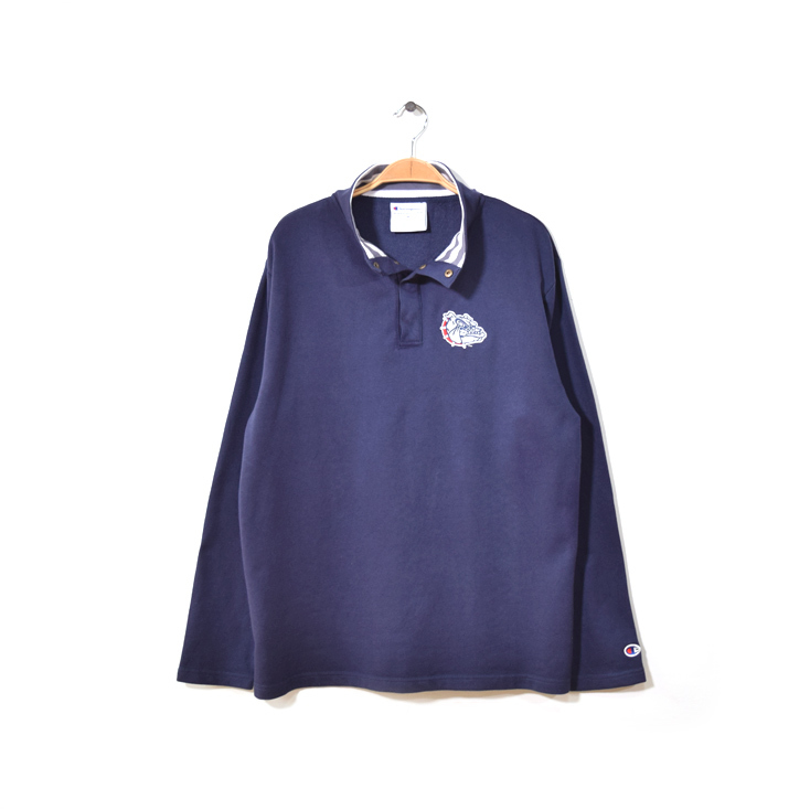 > 【送料無料】チャンピオン ボタン襟 カットソー ブルドッグ 刺繍 薄生地 スウェット トレーナー ネイビー メンズM Champion 古着 CF0363