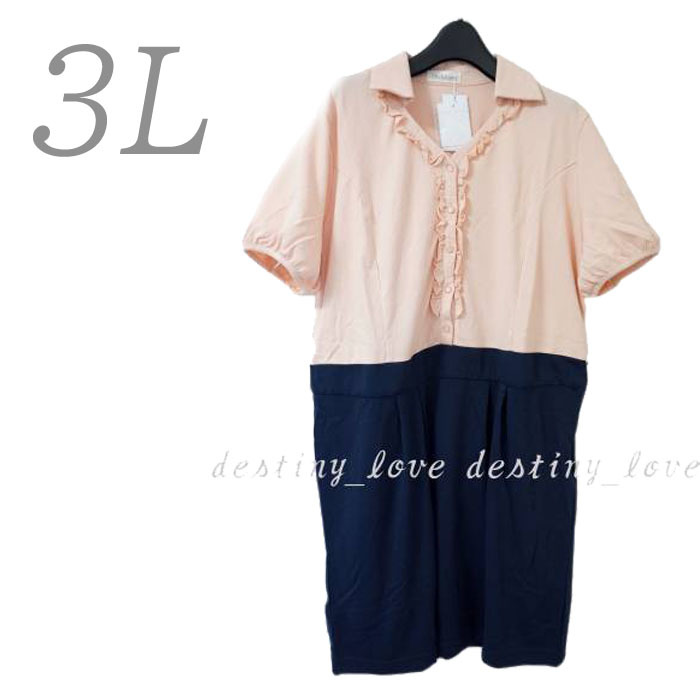 - ●新品/ワンピース/バイカラー/3L/ピンクベージュ/ネイビー/フリル/レディース●f3256