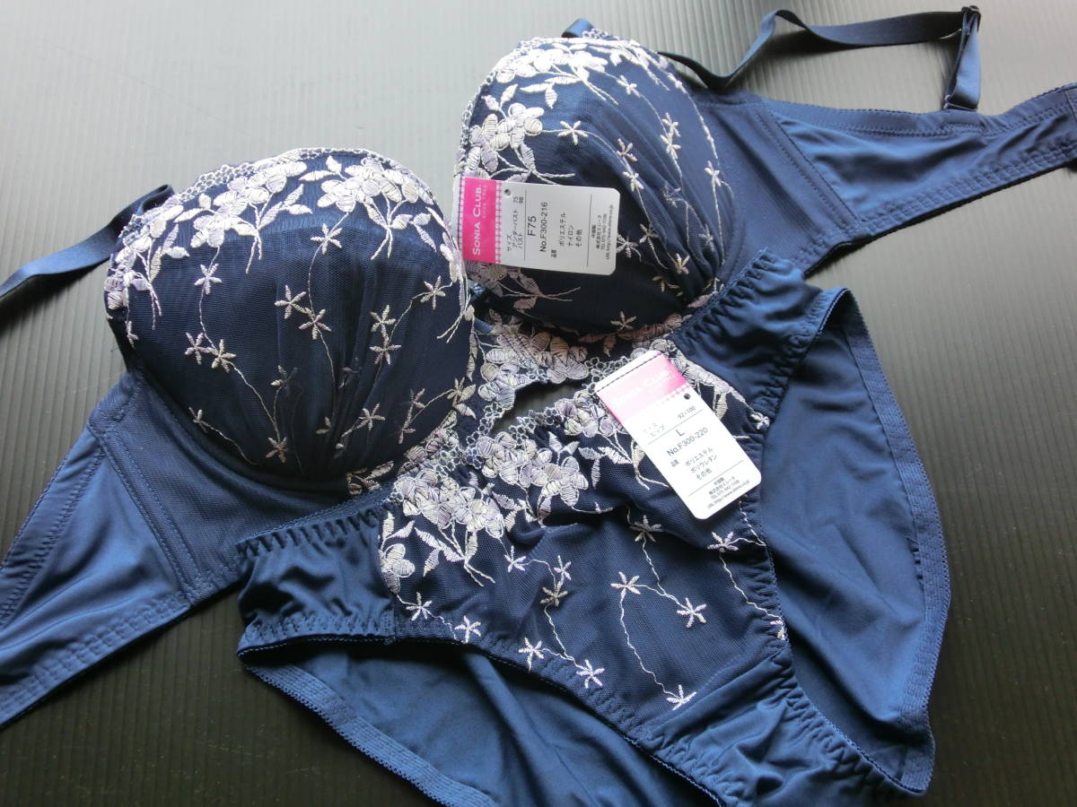 > ☆【F75 L】ネイビー プリティフラワーブーケ刺しゅう ブラジャー・ショーツセット《67-1》