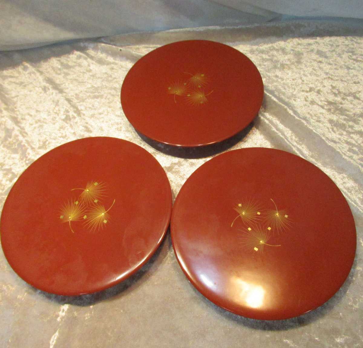 > 【漆器・蒔絵】金蒔絵の菓子皿3枚セット たんぽぽの綿毛文 沈金技法 銘々皿 木皿 ディスプレイ用品 インテリア用品 骨董品 アンティーク
