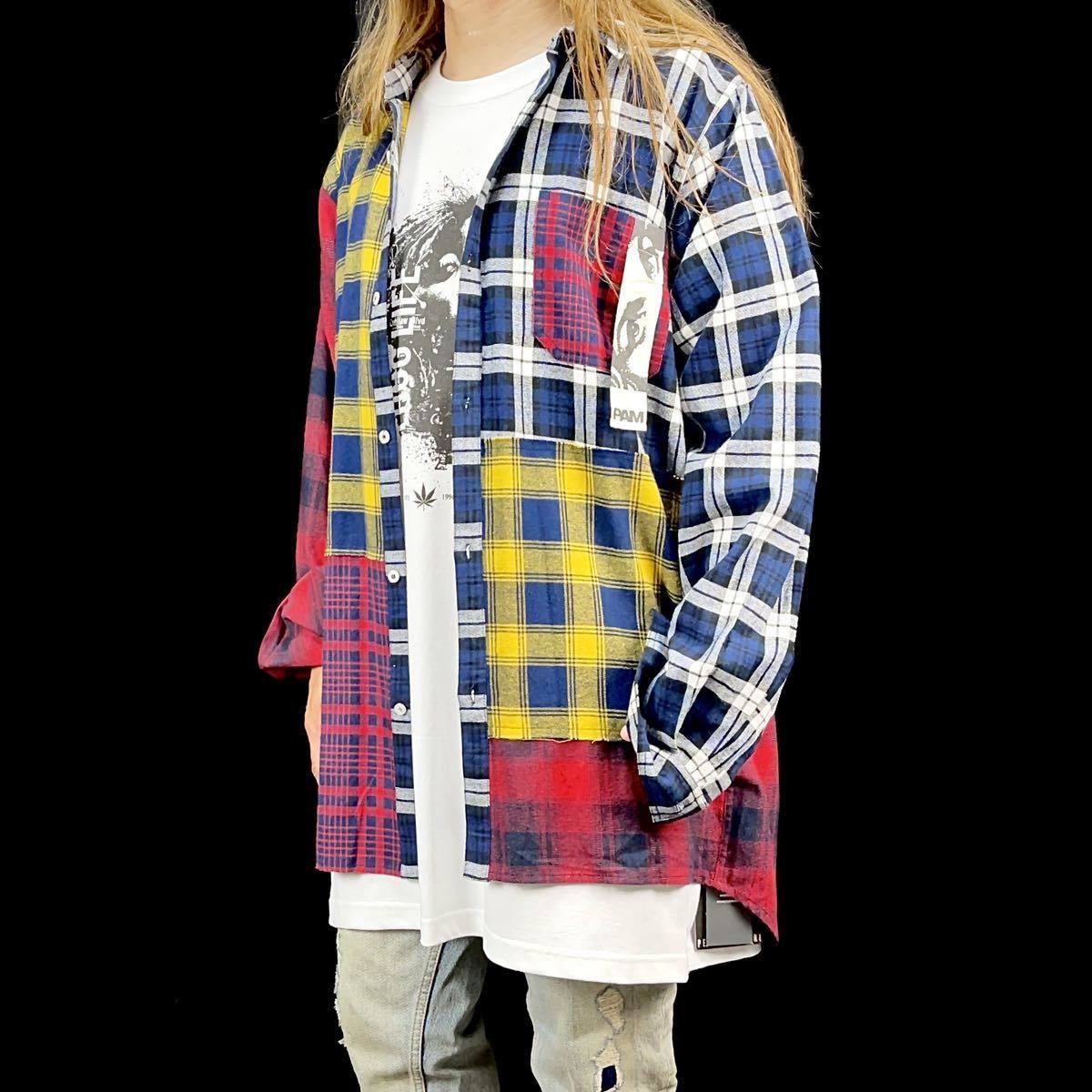 - 新品 パム P.A.M. クレイジー パターン チェック カットオフ パッチワーク オーバー サイズ ワイド フィット ビッグ ロング丈 ネルシャツ