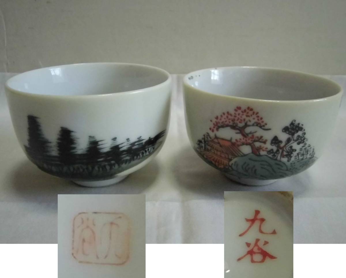 - かなり古い 湯呑み茶碗 九谷焼 柄違い 2客 色絵 水墨画 陶器 茶器 工芸品 レトロ アンティーク