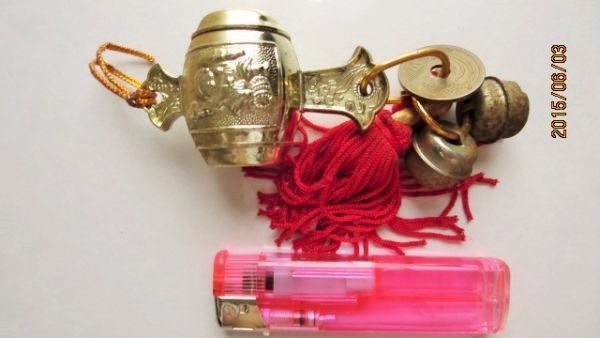 - 再) 古いアクセサリー ミニ打ち出の小槌五円玉鈴付き中古汚れ錆あり