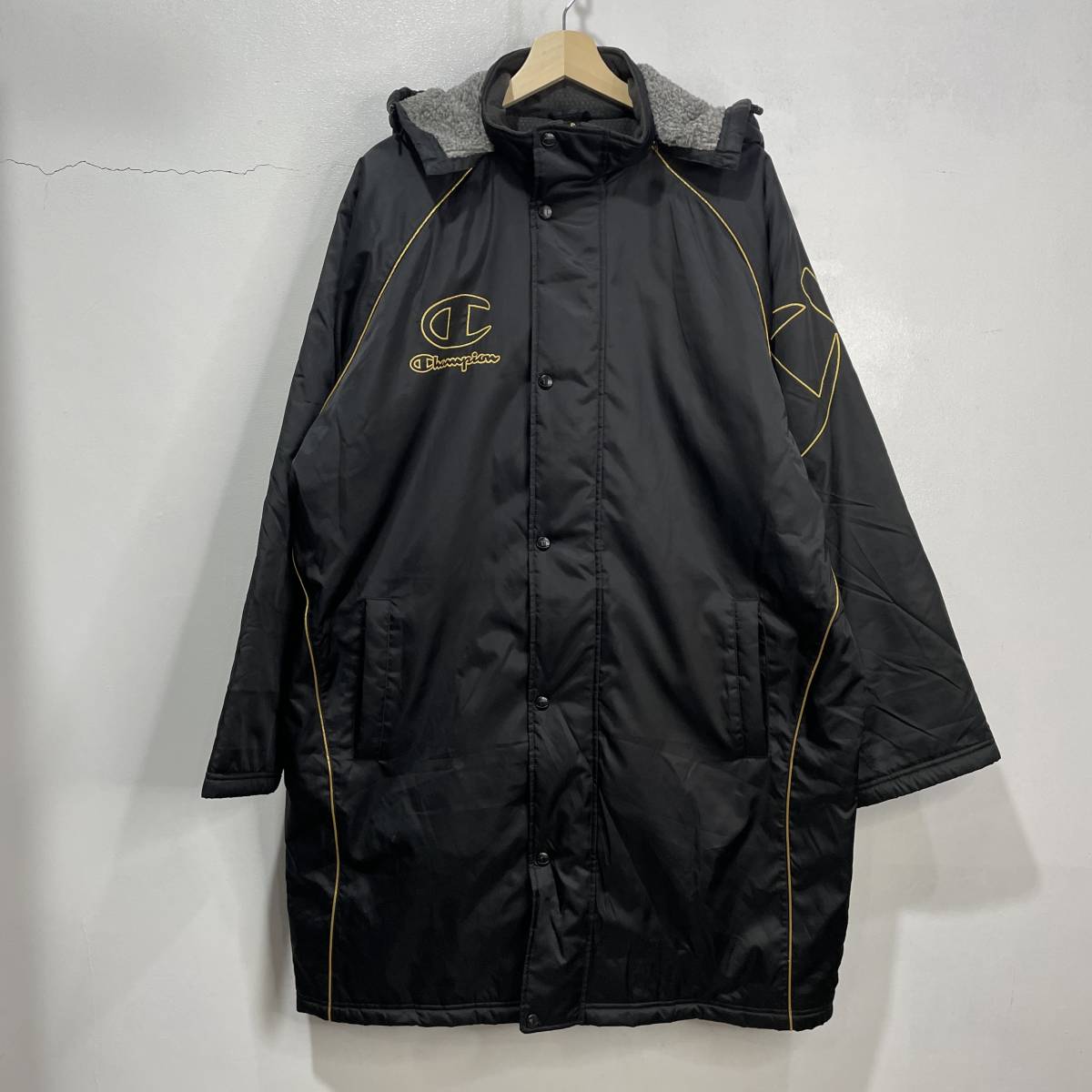 > ☆送料無料☆Champion☆ベントコート☆中綿キルティング☆ロング丈☆ボア☆フード付き☆スポーツ用☆黒☆ロゴ☆L☆H22