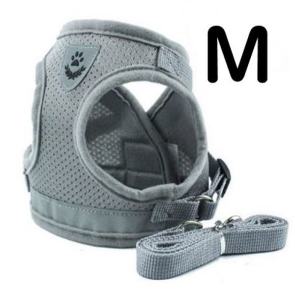 > 犬 猫★ハーネス&リード【M】グレー★メッシュで柔らか 着せやすい 苦しくない 犬服 胴輪 小型犬 中型犬【灰色 M】ベスト型 洋服型 猫服 A