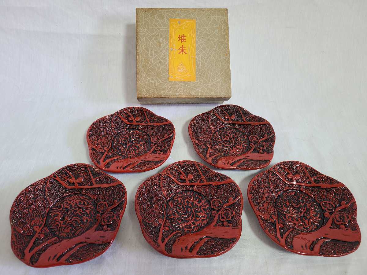 - 堆朱 茶托 五客揃 梅 波柄 茶器 漆器 茶道具 紙箱