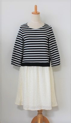 > 美品*is in*イズイム*白×黒:ボーダー柄:カットソー&オフホワイト:花柄:総レース:フレアスカート*七分袖*ドッキングワ*ンピース*M