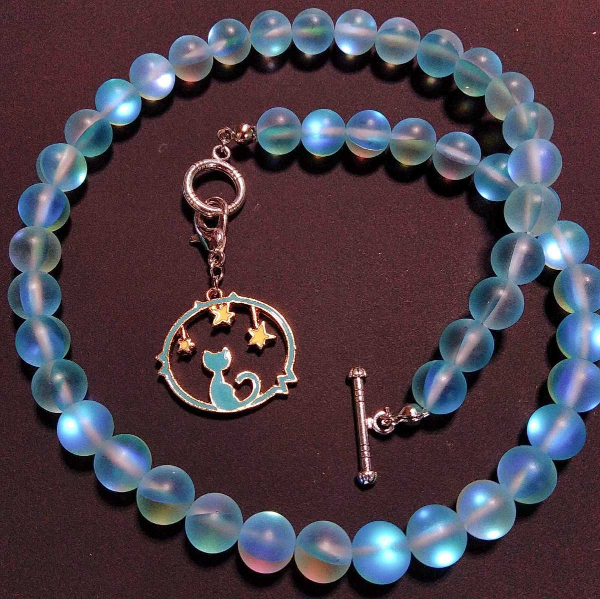 > ルナフラッシュ フロスト(艶消し)ブルー マンテル ネックレス 猫チャーム付き コスプレ ハロウィン ベネチアングラス ベネチアンガラス
