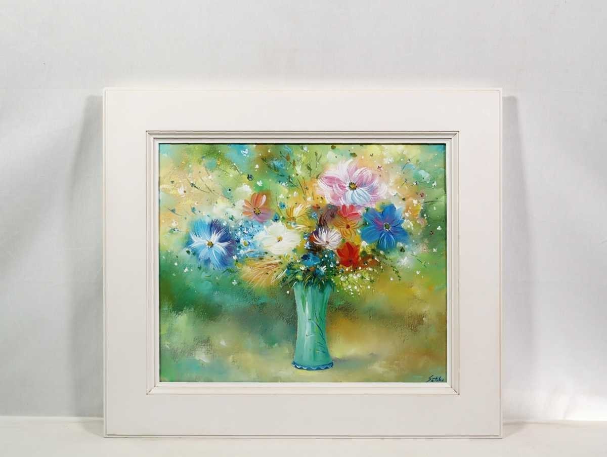 - 真作 中瀬智子 油彩「花」画寸 F8 愛知県出身 象元会会員 四季折々に咲く花々の優しさ愛らしさをテーマ 華やかな背景に瑞々しい花々 5979