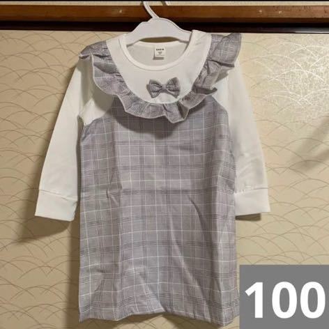 - フリル襟 格子柄 チェック グレー ホワイト 長袖 ワンピース 100